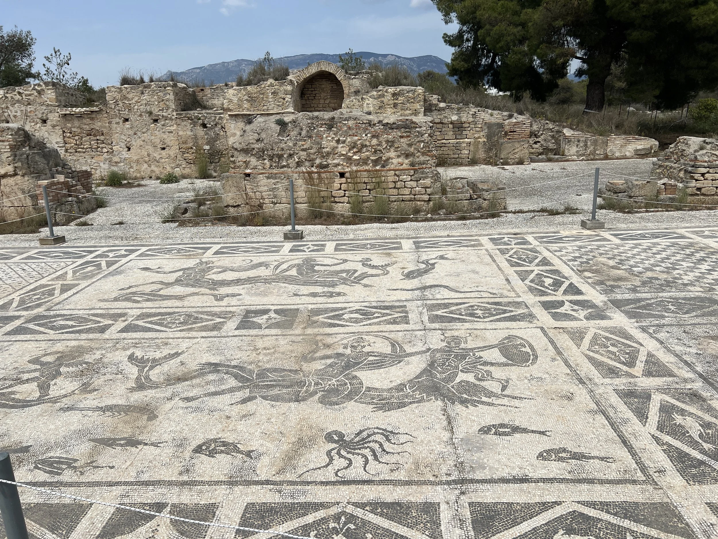 The remains of the Sanctuary of Poseidon at Isthmia date from the 700’s BC. It included temples to other pagan gods such as Cyclopes (Poseidon’s son). Remains excavated here include vessels and bones indicating sacrifices. The baths have restored mosaic floors depicting ocean creatures, Tritons carrying sea nymphs (nereids), and geometric designs. The remains of a starting gate mechanism (Hysplex) for a foot race are visible.
