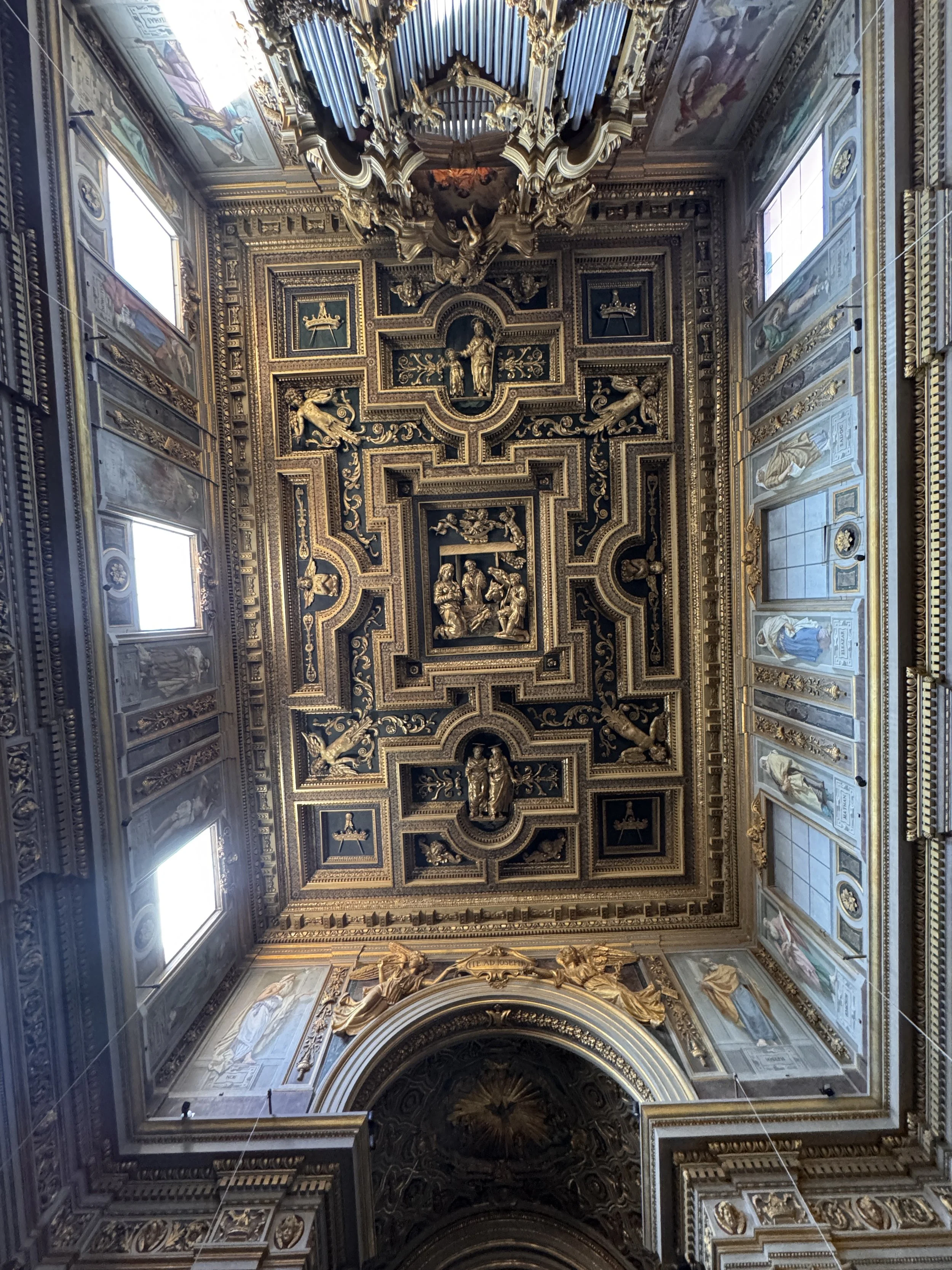 Christian worship at the site increased to the point of building churches directly above the former prison by the medieval era. In the 16th century the current church, San Giuseppe del Falegnami (Church Joseph of the Carpenters) was constructed. The church over the centuries remained tied to the Carpenter’s guild and periodically underwent renovations. It has retained its late renaissance / early baroque style. The interior is grandly decorated and has a coffered wooden ceiling. In 2018 the ceiling of the church dramatically collapsed (can be seen here in security tape footage https://www.facebook.com/share/v/193VJxbTgu/ ) and the church was not reopened until 2021. Honoring St Joseph and the birth of the Savior, above the place where martyrs who first proclaimed the resurrection of the Savior were imprisoned, demonstrates Christian memory and respect for the way God unfolded the plan of our salvation.