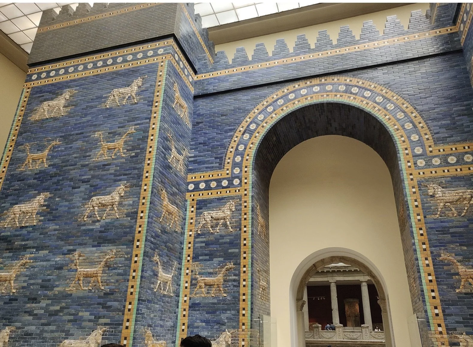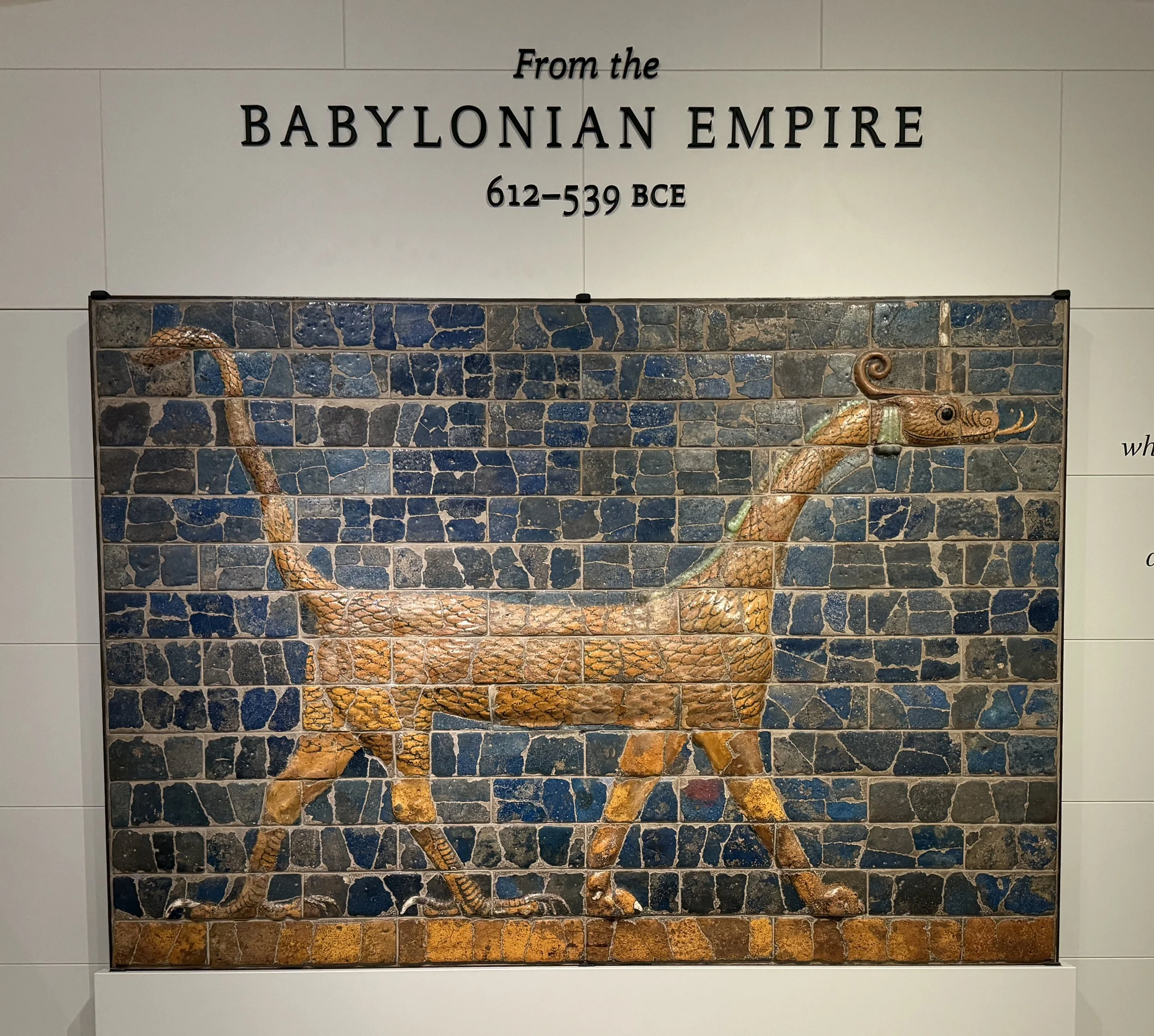 The tile depiction of Mushhushshu from the Processional way in Babylon in the photo is held at the Detroit Institute of Arts and the processing lion tiles pictured are at the Institute for the Study of Ancient Cultures in Chicago. The reconstructed Ishtar Gate and Processional Way are in the Pergamon museum in Berlin which closed for renovations in October 2023 and is expected to remain closed until at least spring 2027.