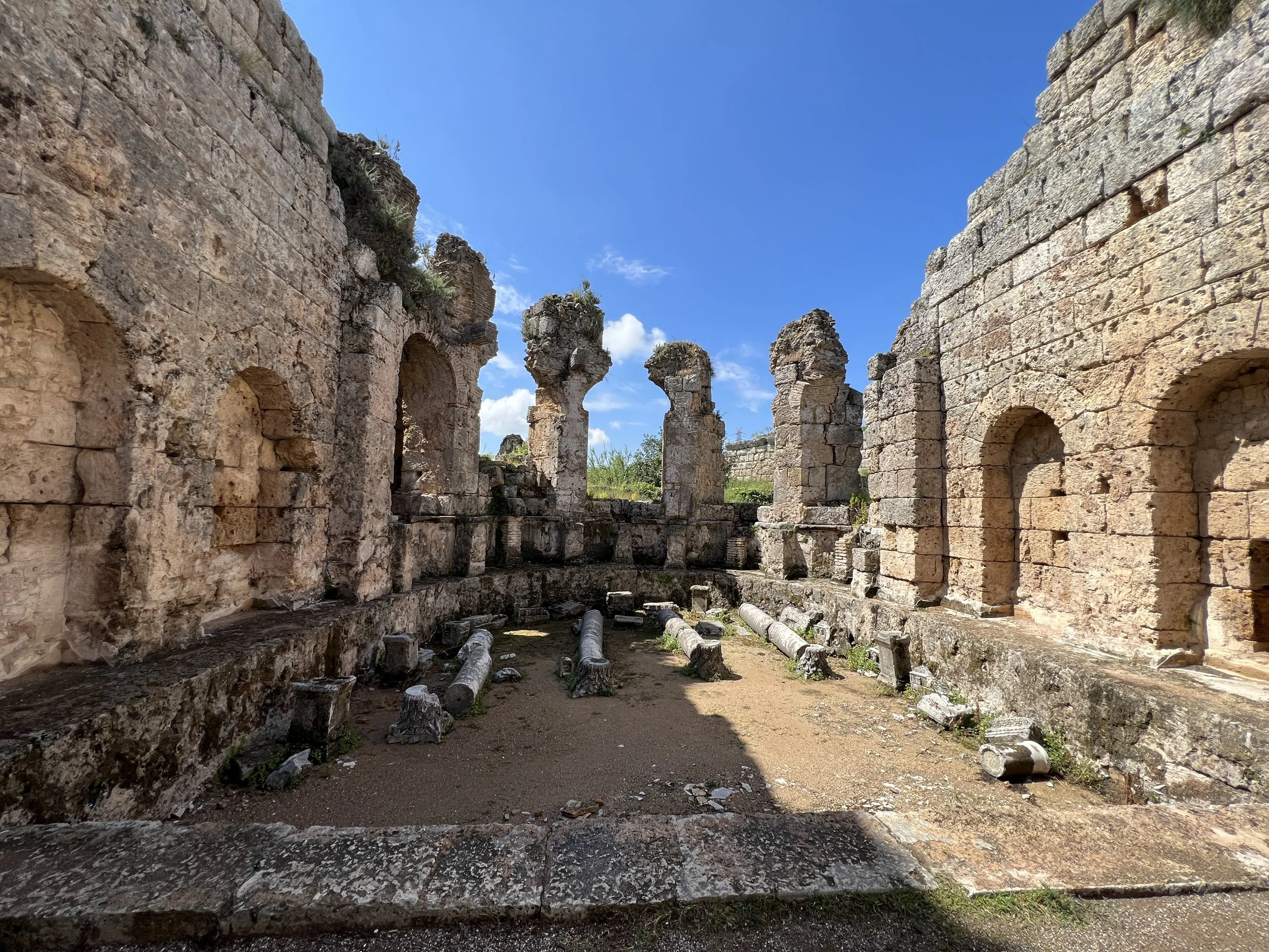 Outside of the Hellenistic city walls are the theater and stadium. Both are Roman era. The stadium has an area at the north end for gladiator fights.