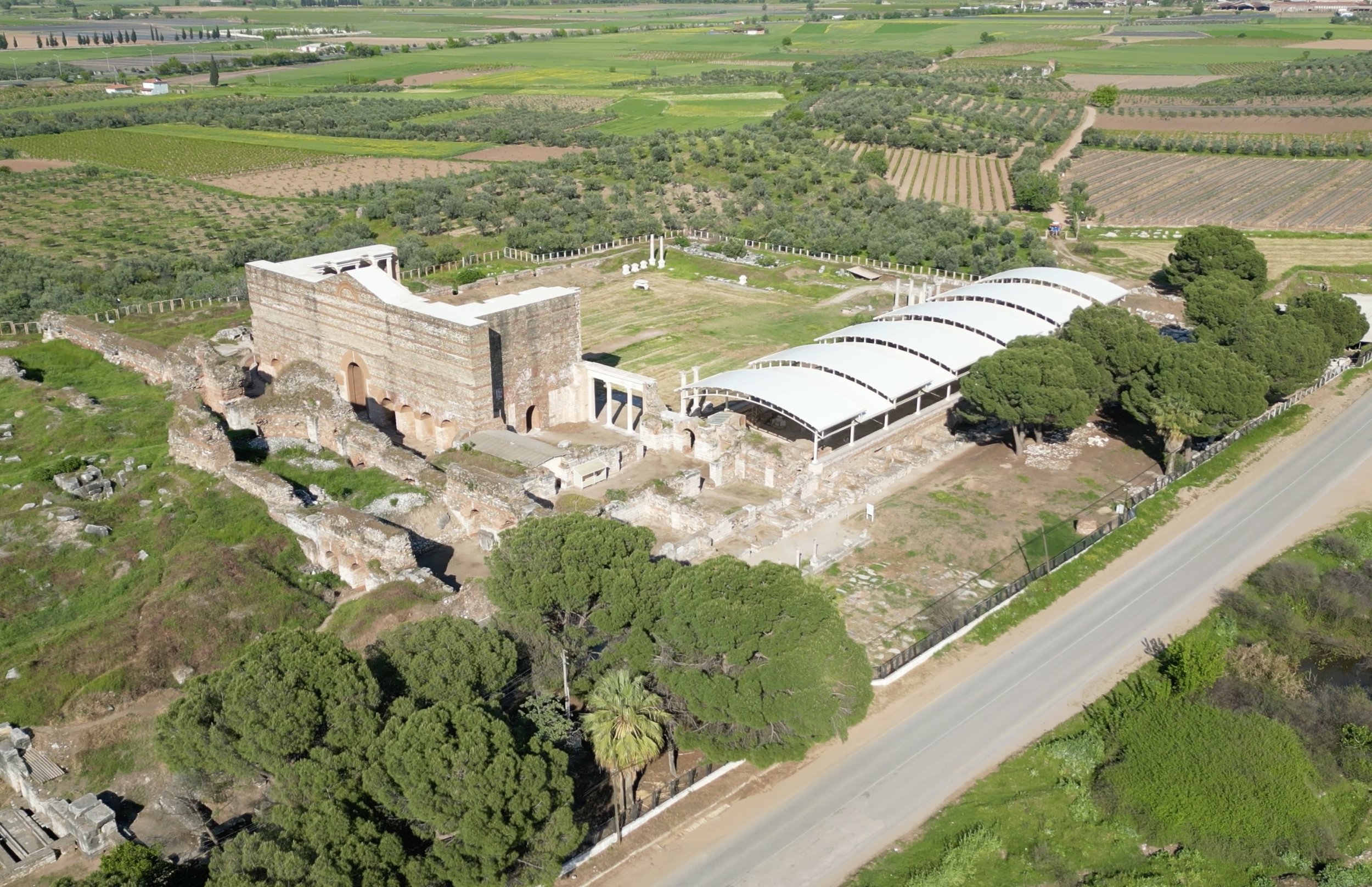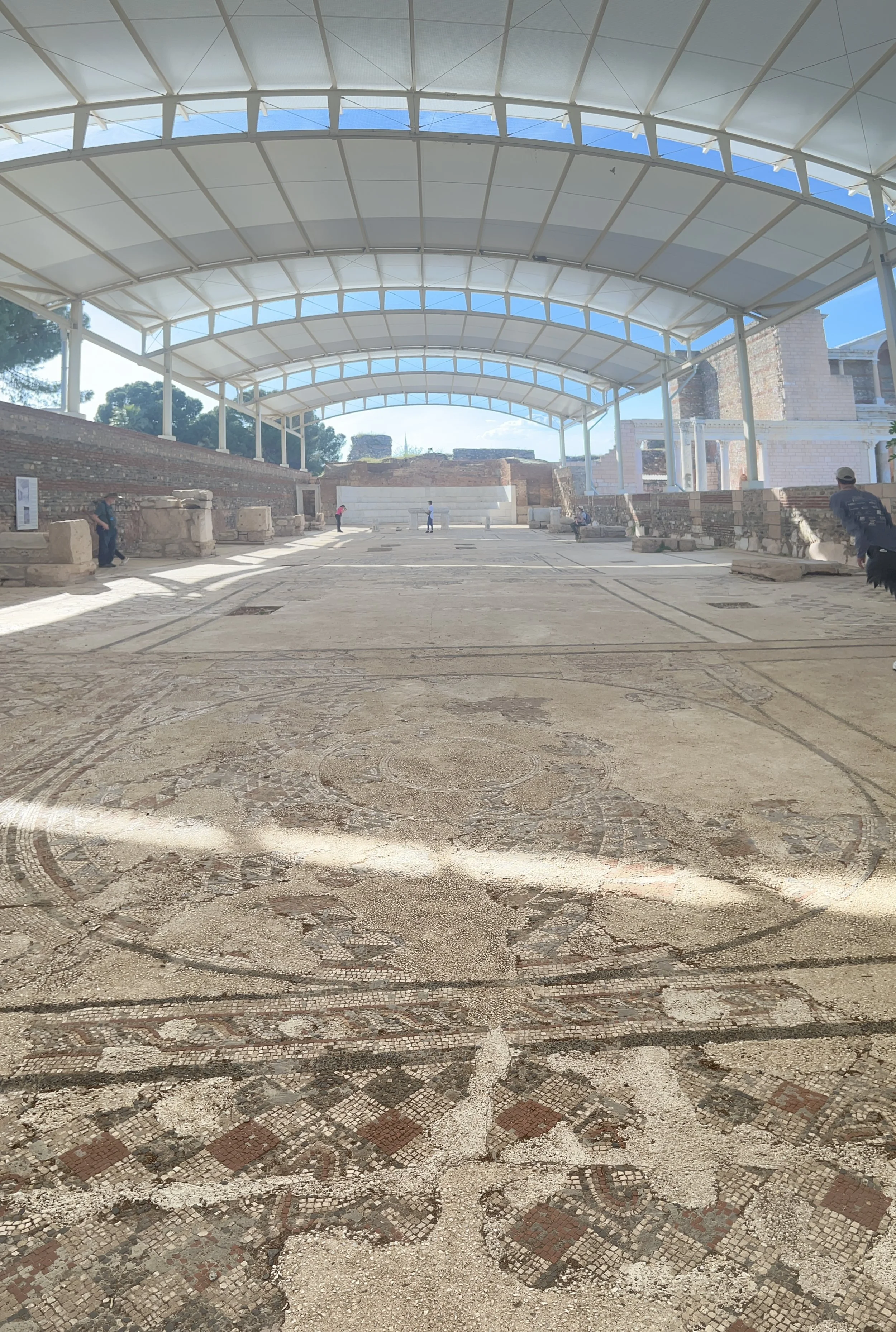 The synagogue at Sardis is the largest ancient synagogue found outside of the Levant. The city of “Sepharad” is mentioned in the Old Testament (Obadiah v20) as being city with a Jewish community - this may be Sardis, meaning Jews had lived here from the 6th century BC onward. Sardis was an important city on the royal road in the Persian era. From what we read in the informative signage on site, the synagogue building may have been given to the Jewish community for their purposes after having been a general civic type structure. It is right up against the gymnasium and baths, which would be unusual for a Synagogue. There are beautiful mosaic floors and wall decorations still intact. Many Greek inscriptions were found here, including a list of prominent Jews with their names in Greek - perhaps a sign of trying to blend in with hellenistic and then roman society. The large table in the apse - perhaps for reading from the torah scrolls - has support legs that date to 2nd century BC to 1st century AD and have engraved roman eagles and other animals - reused pieces but still something that normally would not be found in a synagogue. The apse is lined with stepped half circle benches that look like a byzantine synthronon. At the other end of the synagogue are two Torah Shrines to house the Torah scrolls. In 2021 this area was open to the elements, but this spring we found that there is now a canopy covering the area.